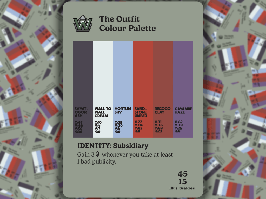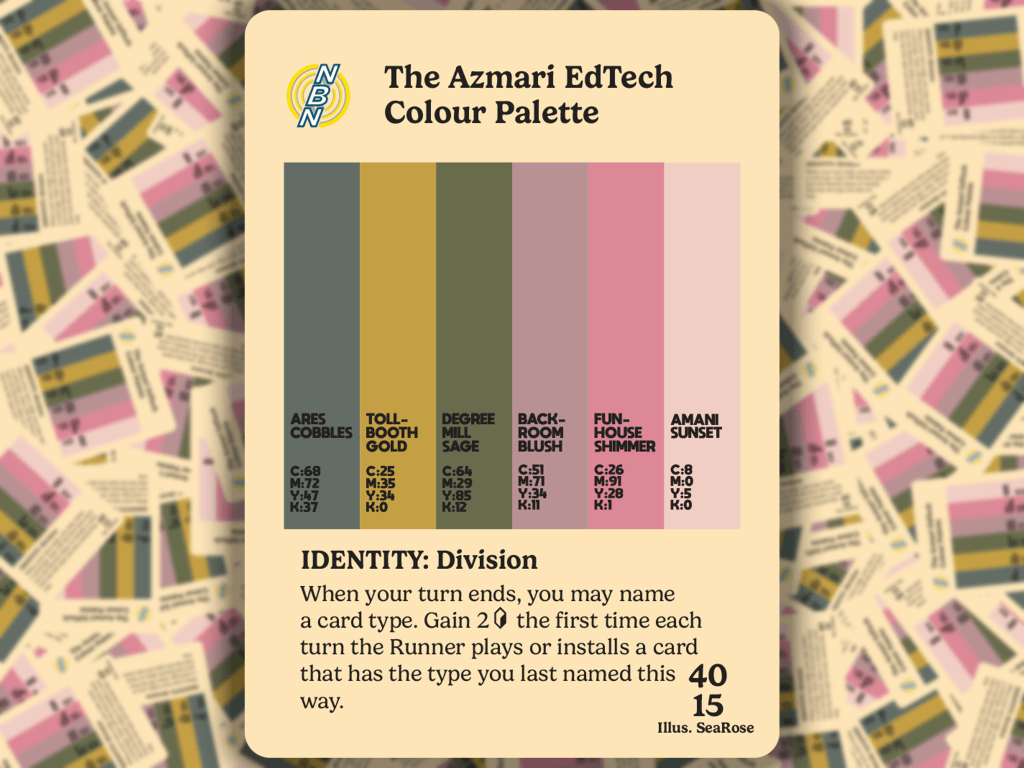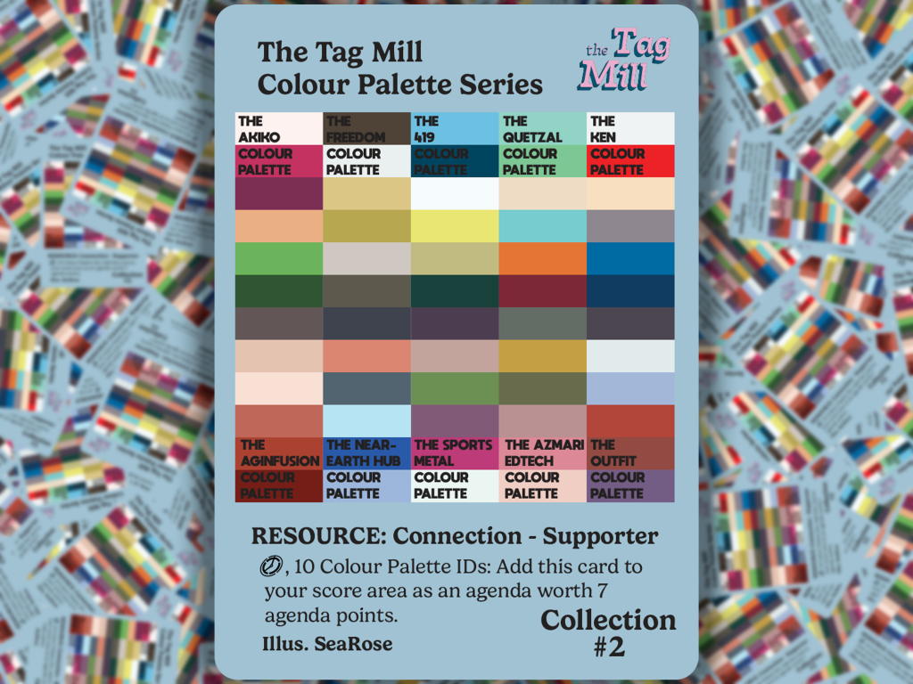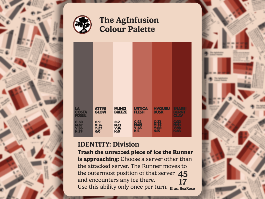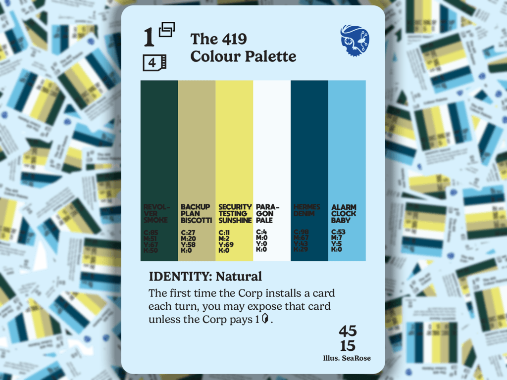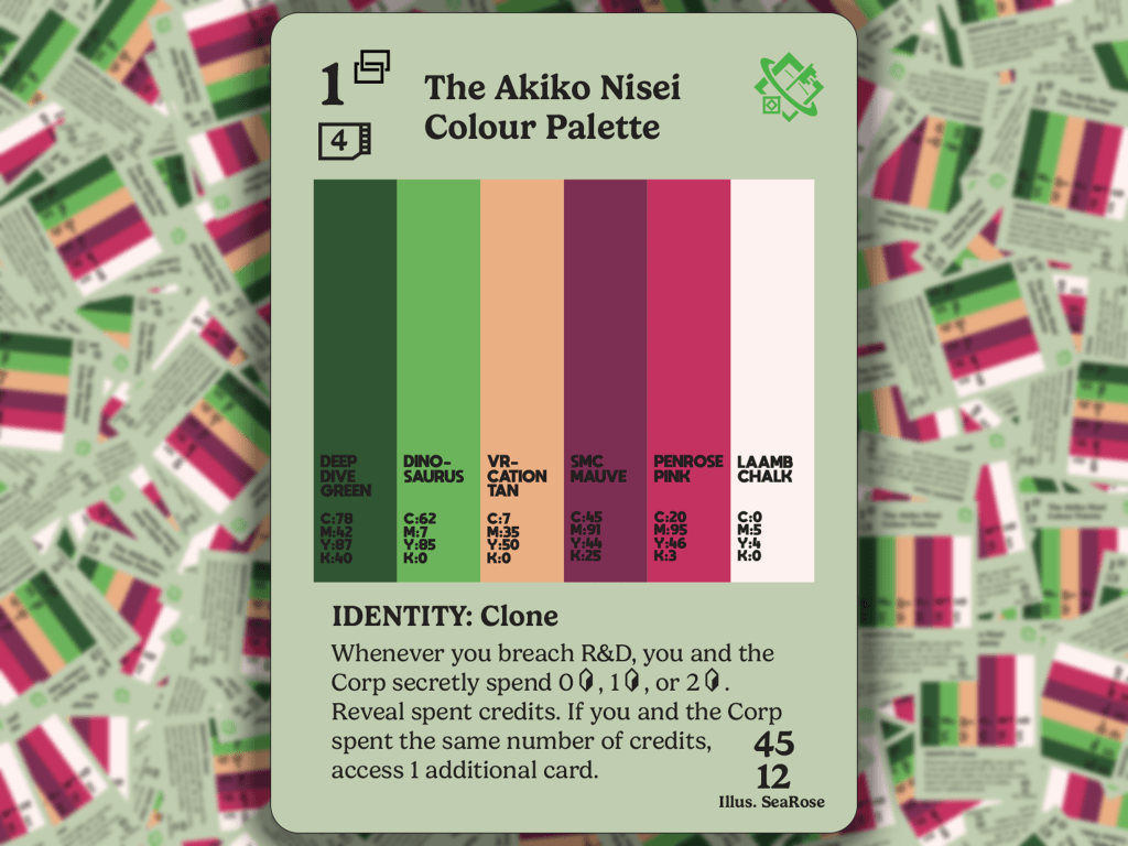 SeaRose loved the idea of applying this to the gritty cyberpunk world of Android and Null Signal Games’ Netrunner. The colour palette for each ID is made up of colours taken directly from the original art, given shade names referencing a similar colour card from that faction. So, for example, Freedom’s colour palette contains Eru Eggnog and Ghosttongue Espresso; Ken’s colour palette contains Bug Out Beige and Boomerang Blue; while on the Corp side Azmari’s palette contains Degree Mill Sage and Amani Sunset and the Outfit’s palette contains Wall to Wall Cream and Svyatogor Ash.