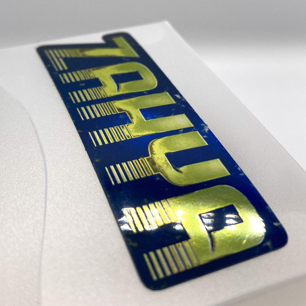 This sticker is printed in high-quality mirror glossy vinyl and measures 6.5cm x 2.3cm, which fits nicely on all deck boxes, token cases, water bottles, and anything else a crimial might be carrying.